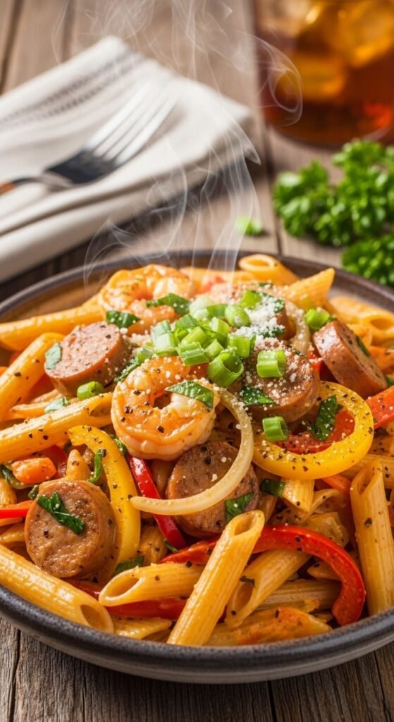 - Return the cooked chicken or shrimp to the skillet and fold in the drained penne until everything is coated and heated through.