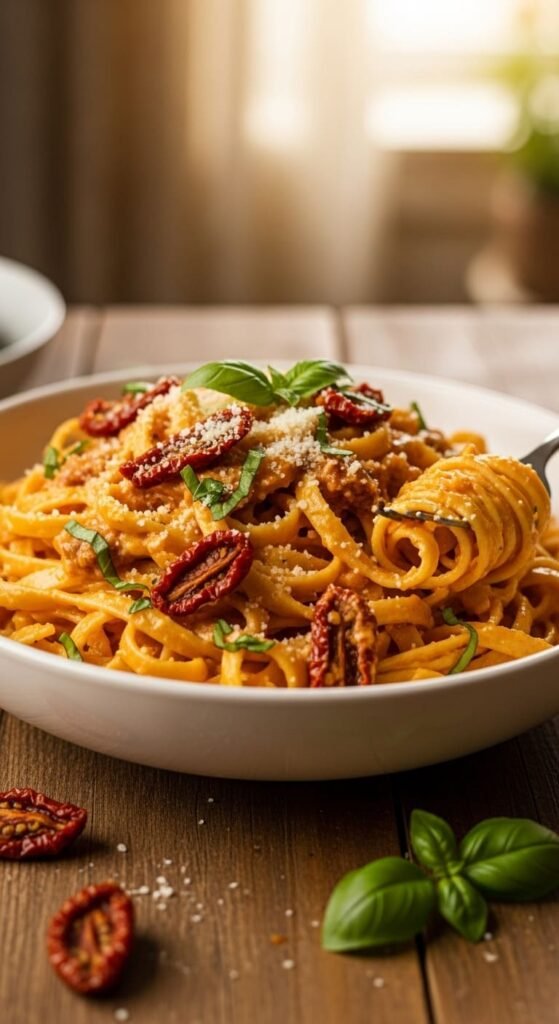 Sun-Dried Tomato Alfredo: creamy, tangy comfort with a sun-kissed twist.