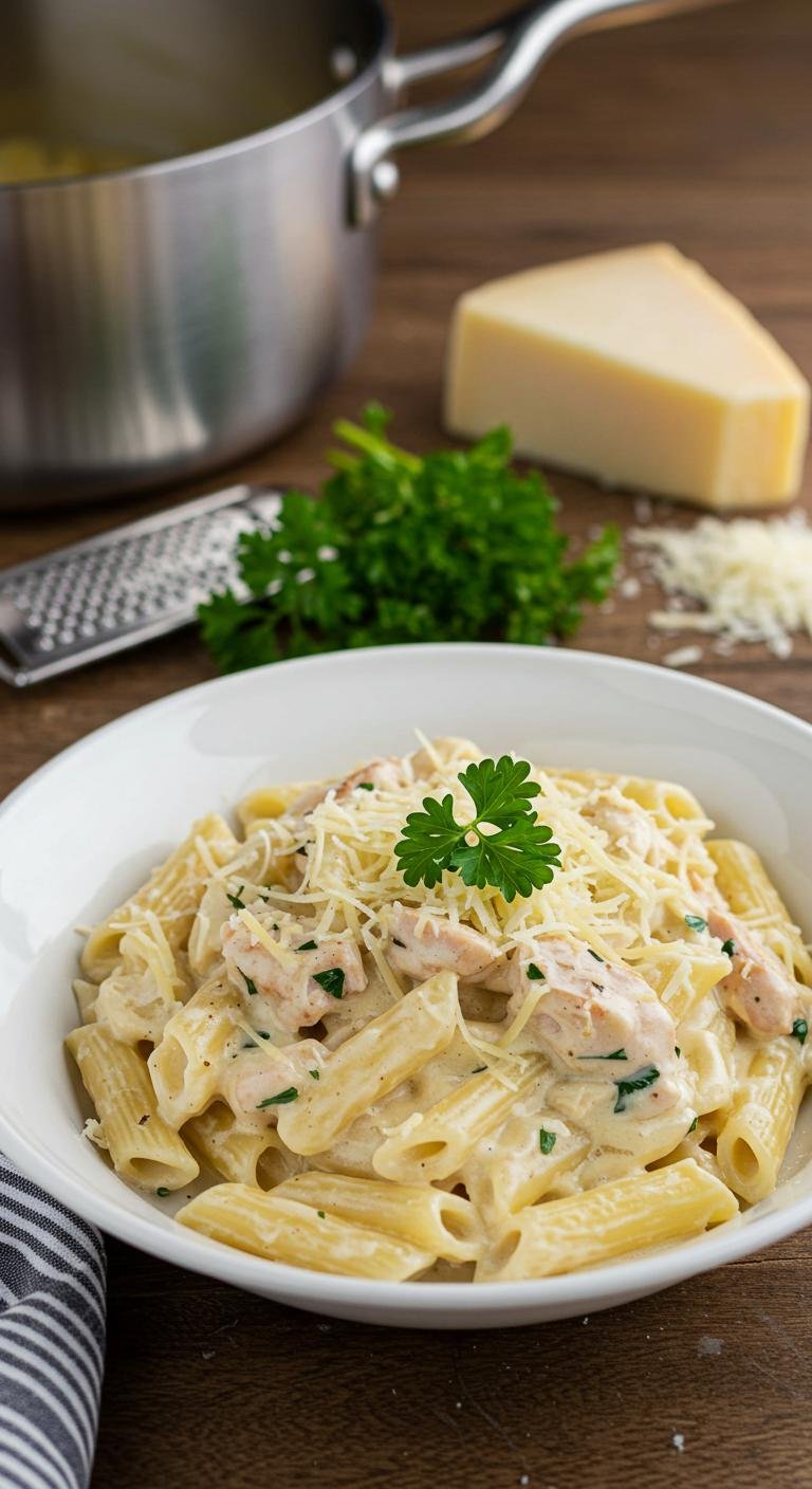 Enjoy your rich, one-pot chicken Alfredo—comfort in a bowl with minimal cleanup!