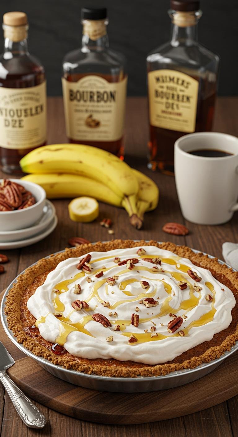 A cozy, boozy twist on classic banana cream pie — warm pecan crust, maple-kissed filling, and a splash of bourbon.