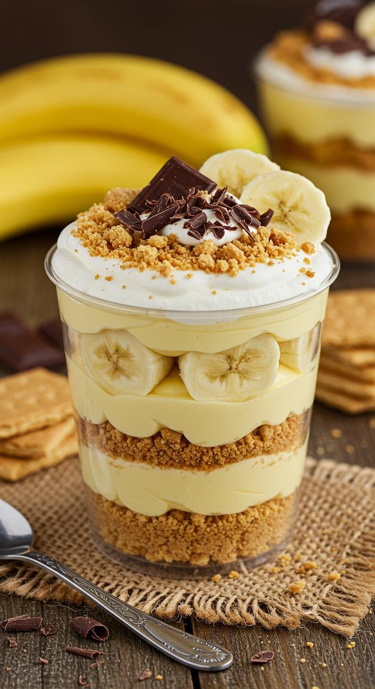 - Before serving, top with extra banana slices, a sprinkle of graham crumble, and optional chocolate shavings or nuts.