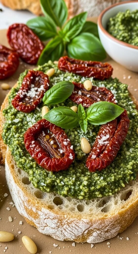 Bright, tangy basil pesto gets a rich, sun‑dried tomato boost — perfect for pasta, sandwiches, or a zesty dip.
