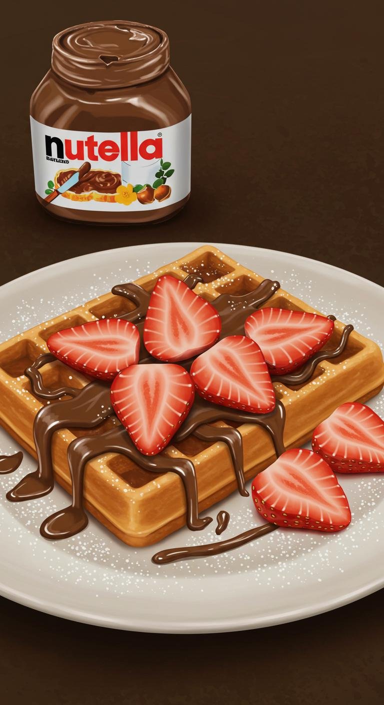 A warm, crispy Belgian waffle crowned with gooey Nutella and fresh strawberries — breakfast bliss in every bite.