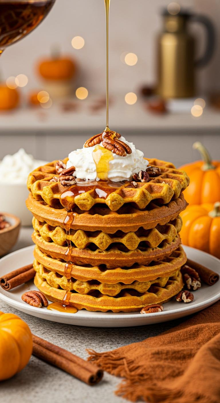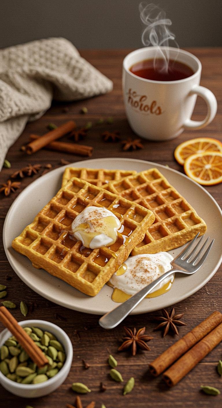 Chai-Spiced Belgian Waffles With Honey — warm, aromatic waffles with cozy chai spices and a drizzle of sweet honey.