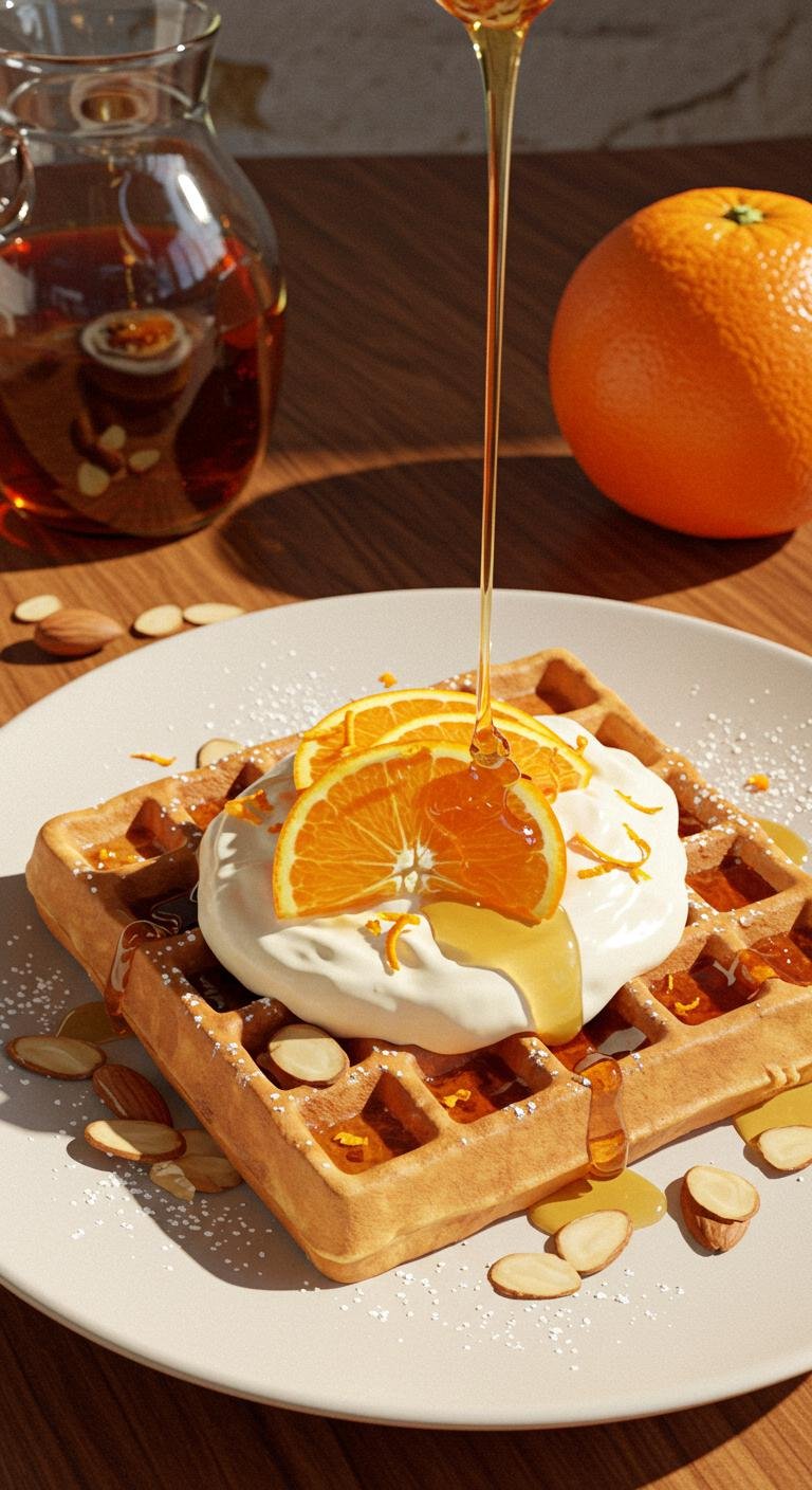 - Serve warm waffles spread with a dollop of sweetened mascarpone, a sprinkle of powdered sugar, and optional orange slices, syrup, or toasted almonds.