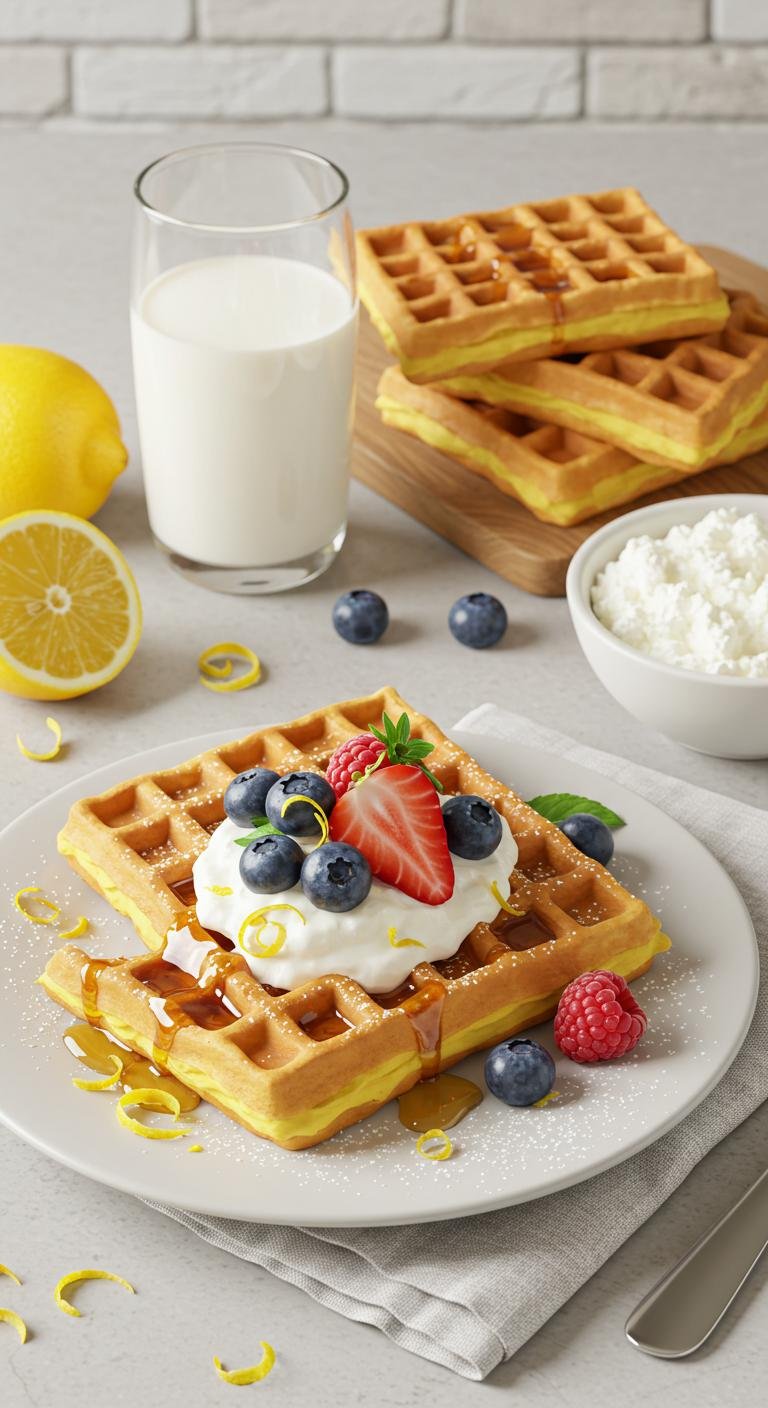 Bright, fluffy waffles with a tangy lemon zing and creamy ricotta for a sunny breakfast.