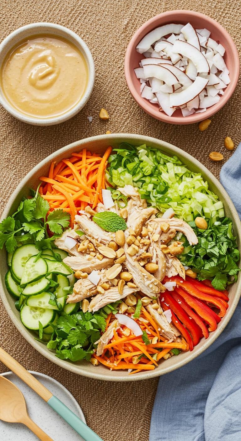 A bright, crunchy Thai Coconut Chicken Salad with creamy peanut dressing — light, tangy, and perfect for weeknight dinners or picnic lunches.