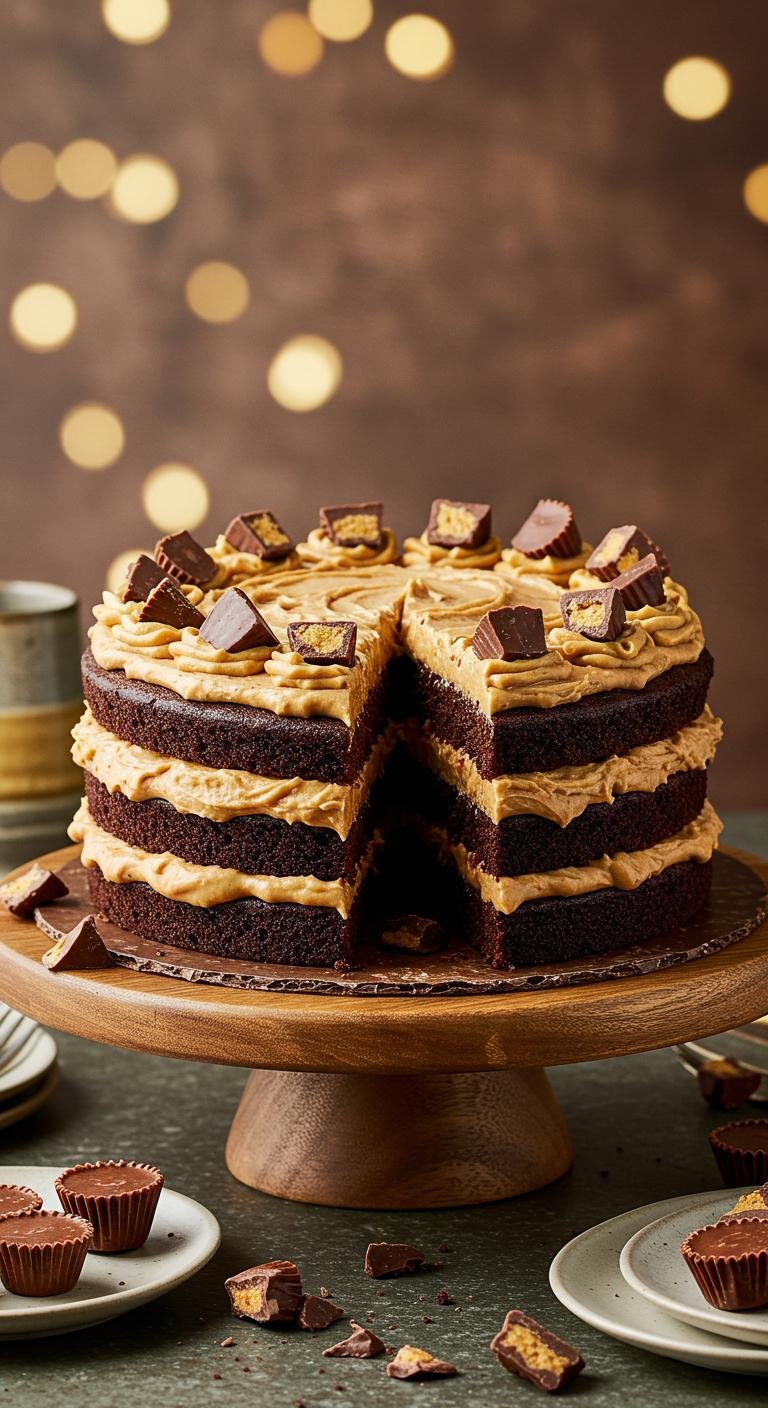 - Top with the second cake layer, frost the top and sides with remaining frosting, and press chopped peanut butter cups around the top edge and center.