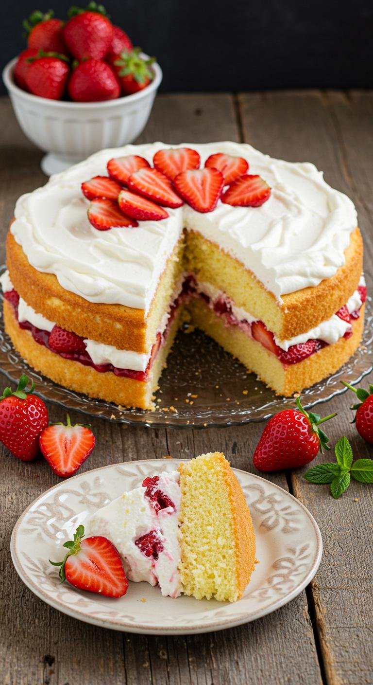 - While cakes cool, toss sliced strawberries with 2 tbsp sugar and 1 tbsp lemon juice; let sit 20–30 minutes to macerate and release juices.