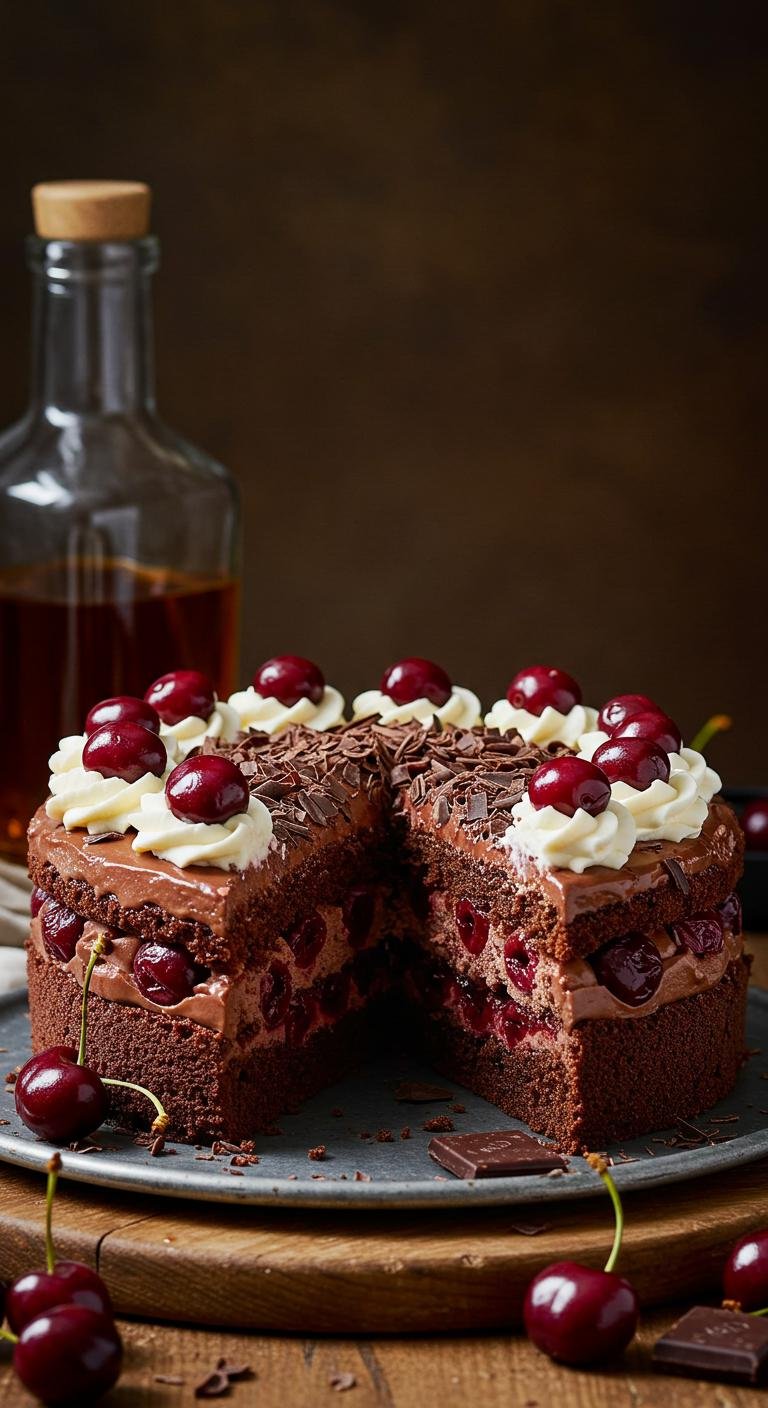 Whiskey-Infused Black Forest Torte — a boozy, decadent twist on the classic that balances dark chocolate, cherries, and a kiss of whiskey.