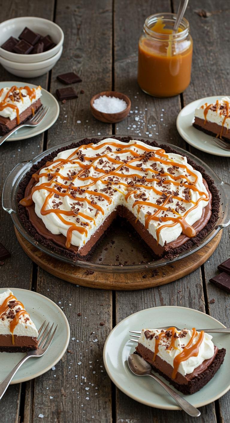 - Before serving, spread or pipe whipped cream over the chilled pie, drizzle extra salted caramel over the top, and sprinkle with chocolate shavings or a dusting of cocoa powder.