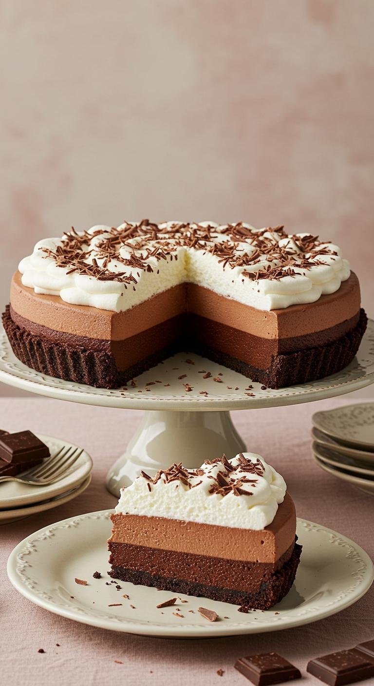 Decadent triple-chocolate mousse pie — three layers of airy chocolate bliss in one slice.