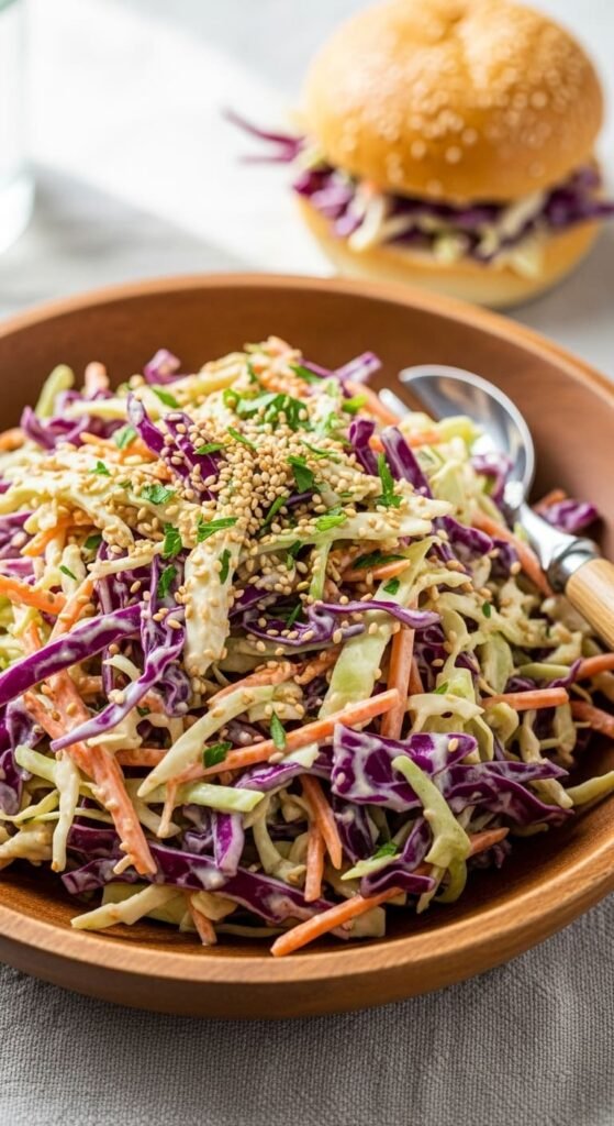 Bright, creamy Vegan Tahini Coleslaw — tangy, nutty, and perfect on sandwiches or as a crunchy side.