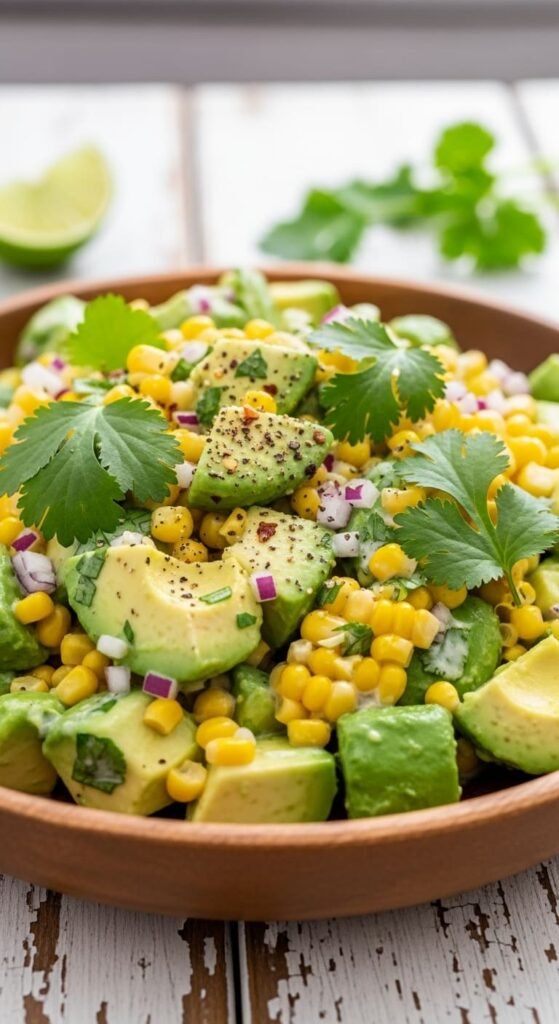 Enjoy this creamy avocado and corn salad as a zesty side, taco topping, or a light, colorful main — it’s sunshine in a bowl!