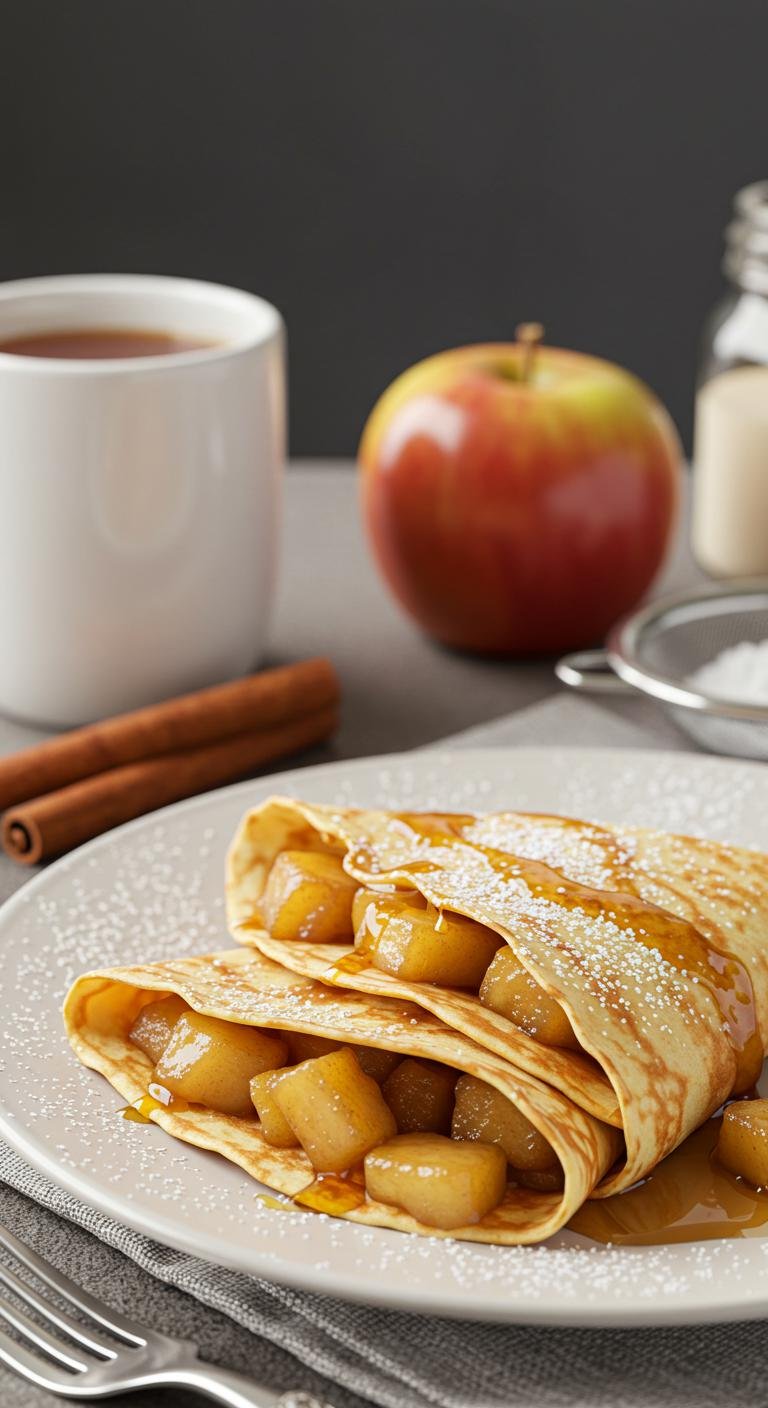 - Spoon a portion of the warm cinnamon apples onto each crepe, fold or roll, and top with powdered sugar or syrup as you like.