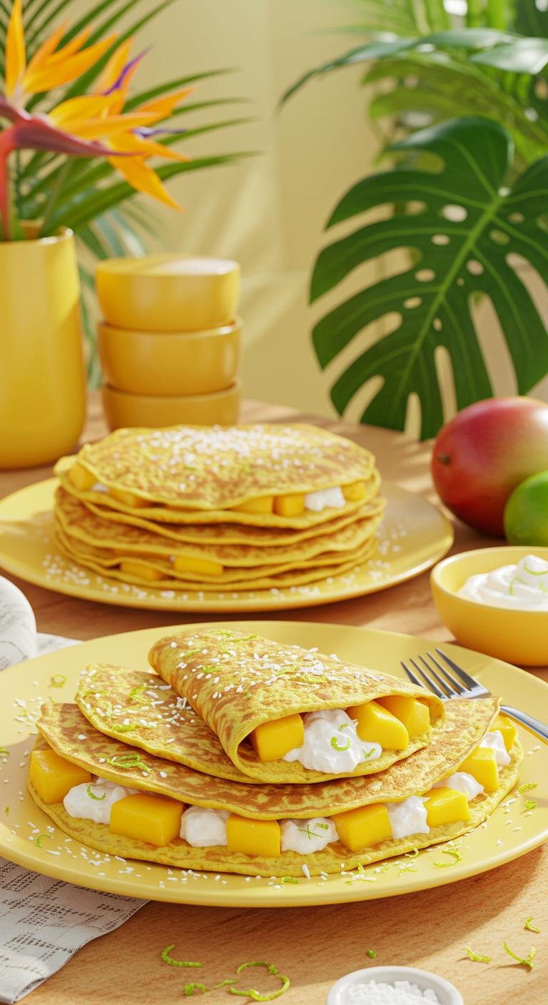 Bright, sunny crepes filled with tropical mango and creamy coconut — like a vacation on a plate.