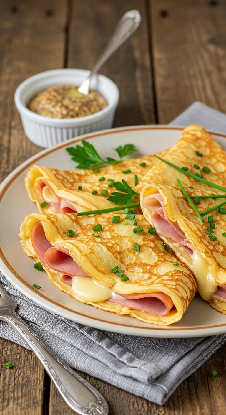 Enjoy these warm, cheesy ham and Gruyère crepes with a bright Dijon bite — elegant, quick, and irresistible.