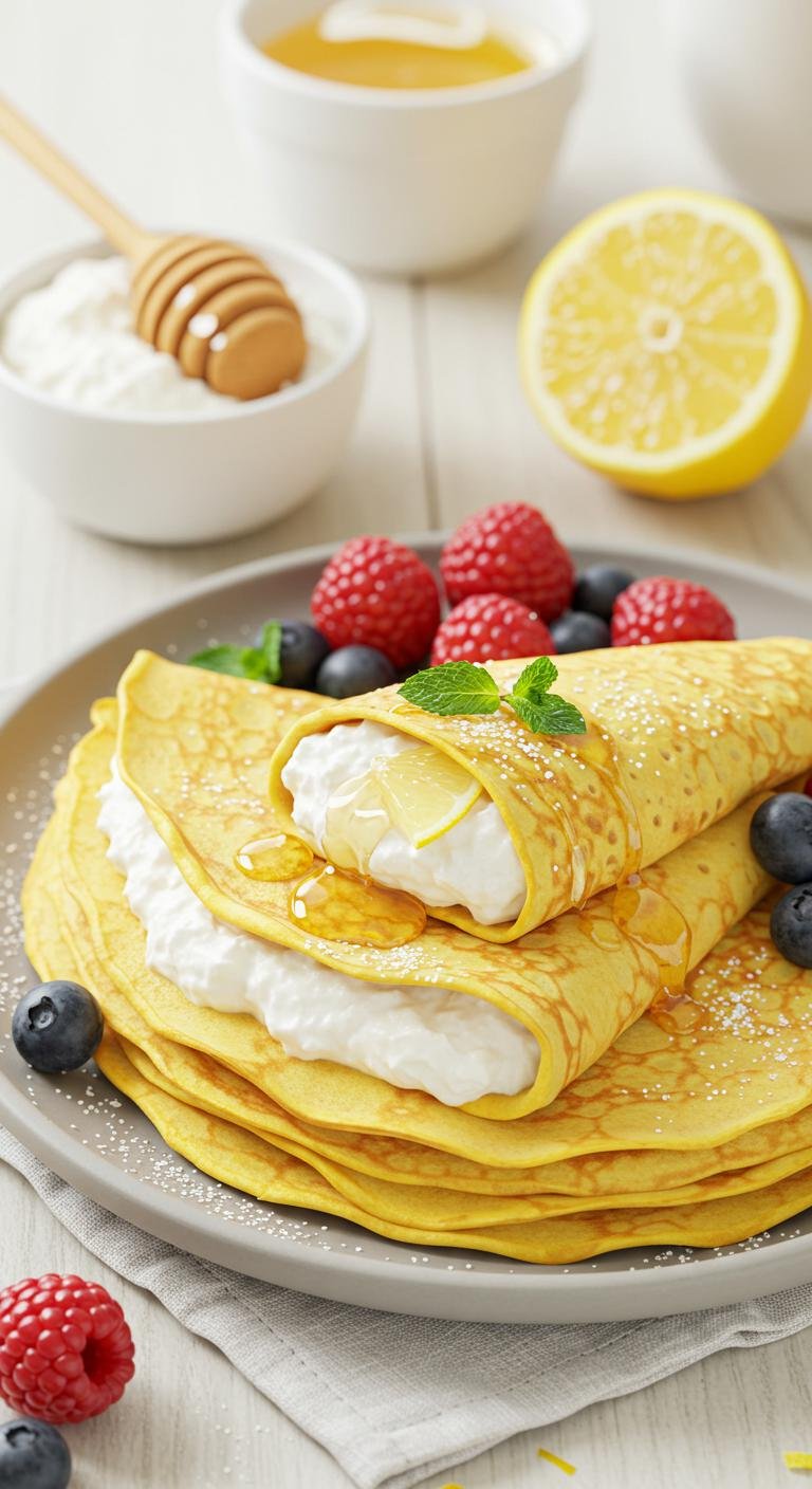A bright, tender crepe filled with creamy ricotta, a kiss of lemon, and a drizzle of honey — light, fresh, and irresistible.
