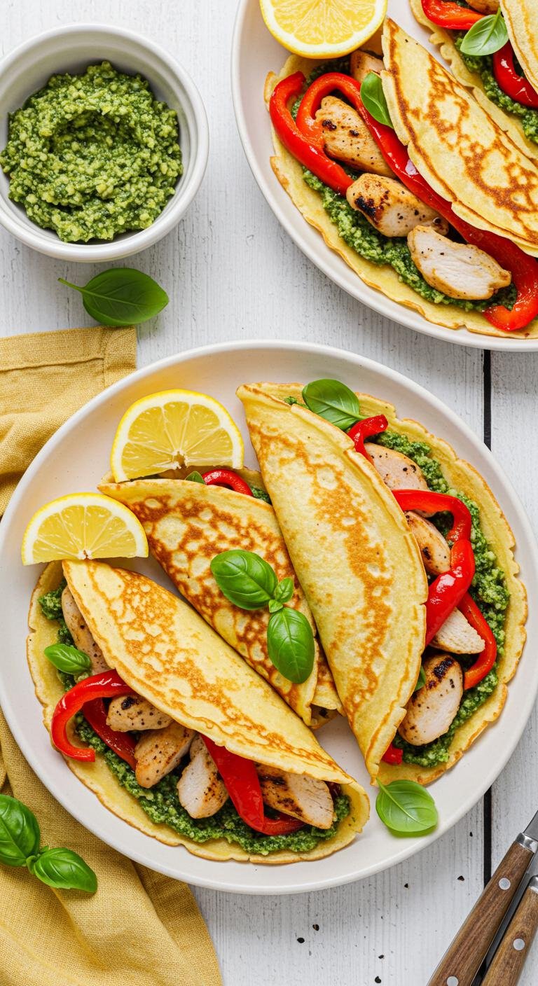 Savory, vibrant crepes stuffed with juicy chicken, bright pesto, and sweet roasted red peppers — perfect for a quick gourmet meal.
