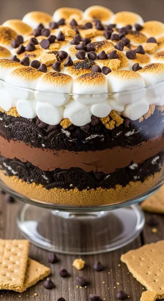 A gooey, crunchy S’mores Dirt Cake that tastes like campfire treats with a graham cracker crust — no fire required.