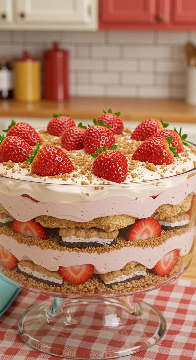 A playful twist on classic strawberry shortcake — creamy, cakey, and delightfully “dirty” with cookie crumbs.