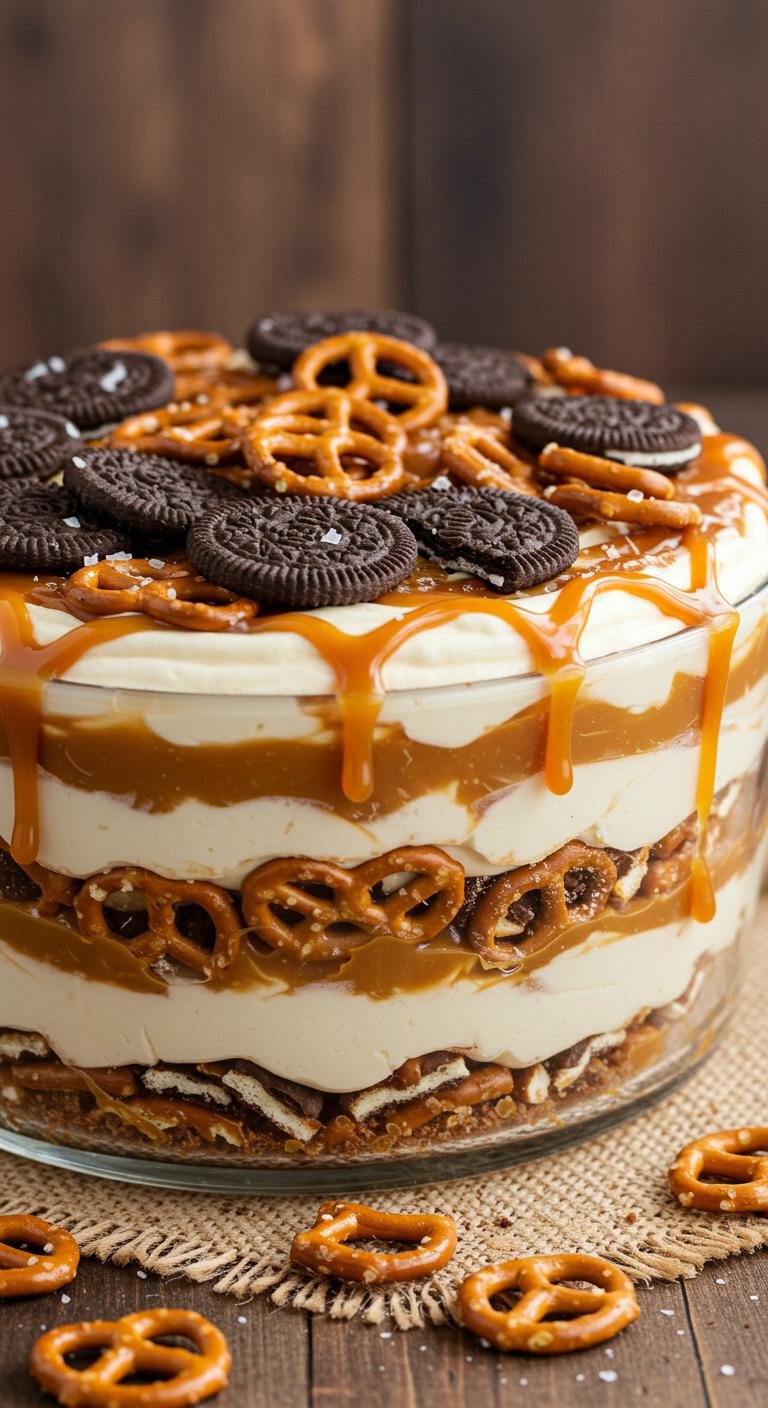 A sweet-and-salty twist on classic dirt cake — creamy layers, crunchy pretzels, and gooey caramel make this dessert irresistibly fun.