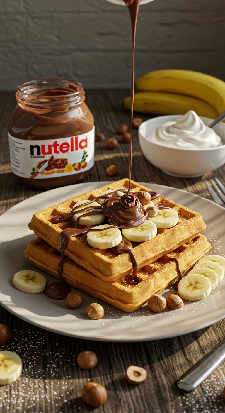 A warm, chocolate-hazelnut hug folded into crisp, golden waffles.