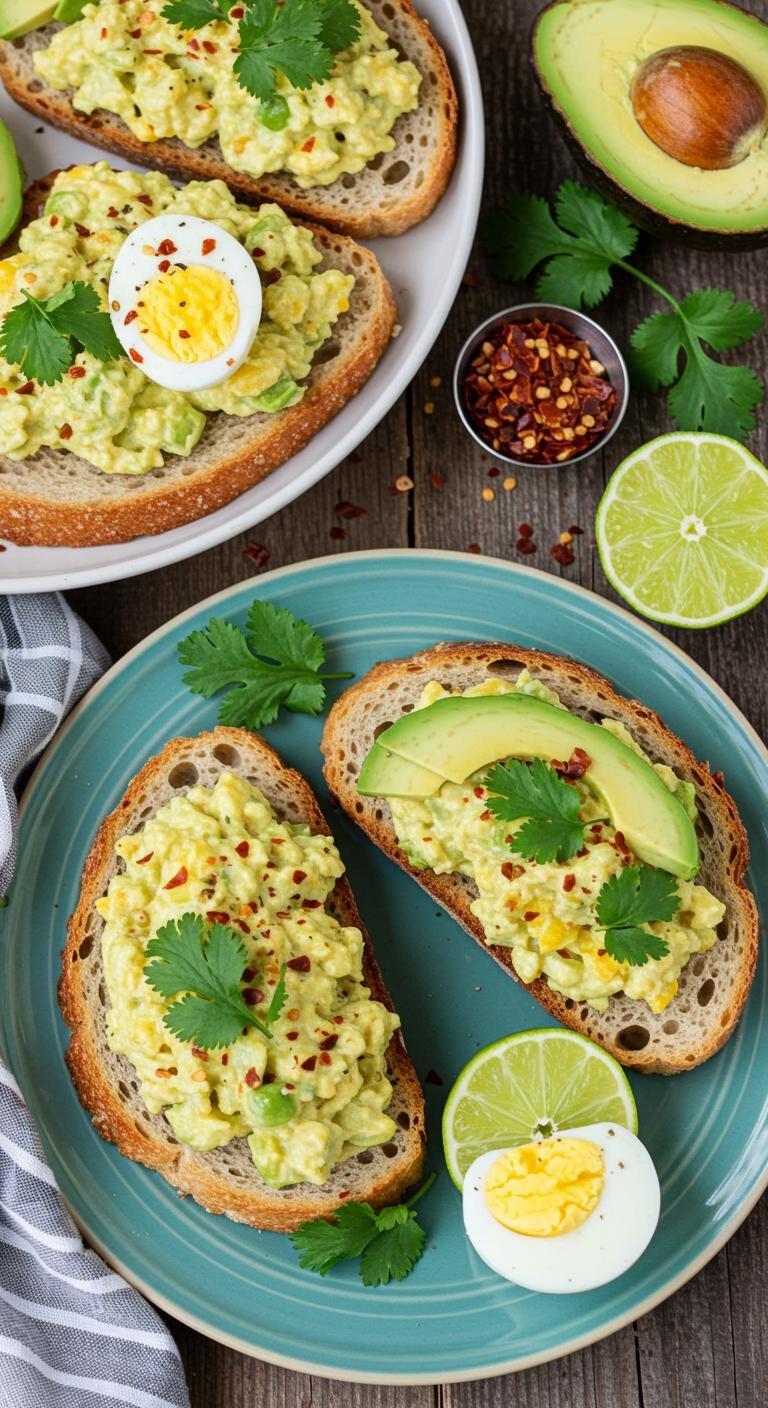 - Spoon a generous layer of egg salad onto each toast. Top with cilantro/parsley, sliced avocado, and a squeeze of lime if desired.