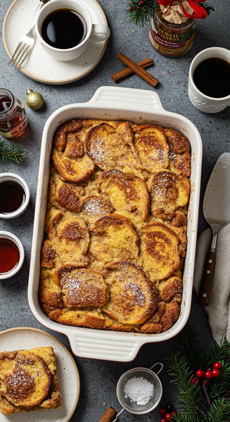 A cozy, festive overnight eggnog French toast casserole that soaks up holiday flavors for an easy, crowd-pleasing brunch.