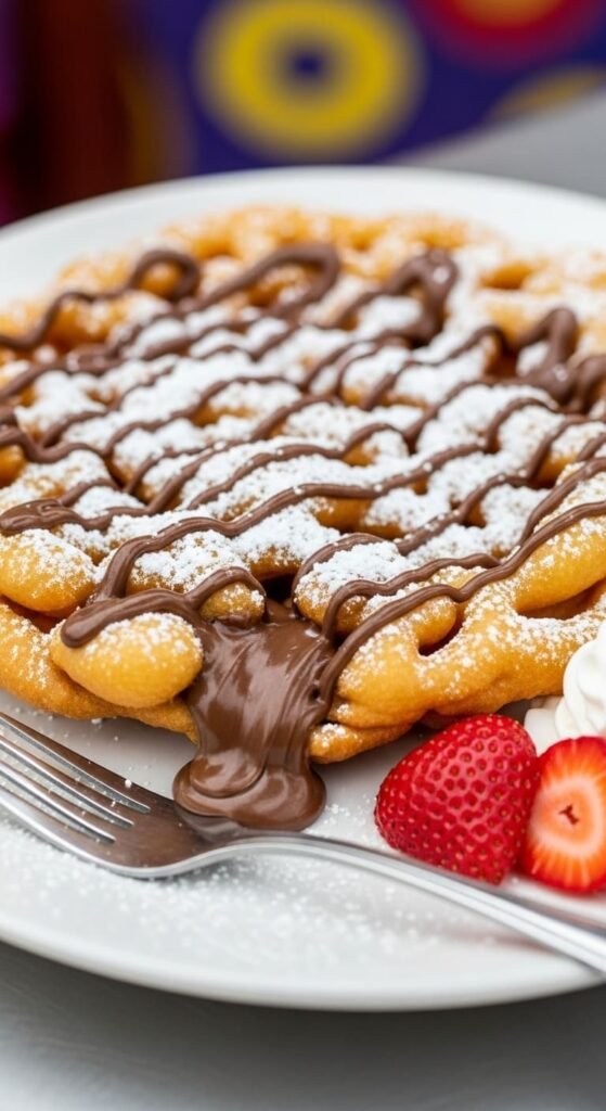 Nutella-Stuffed Funnel Cake — crispy fried golden batter with a gooey chocolate-hazelnut surprise.