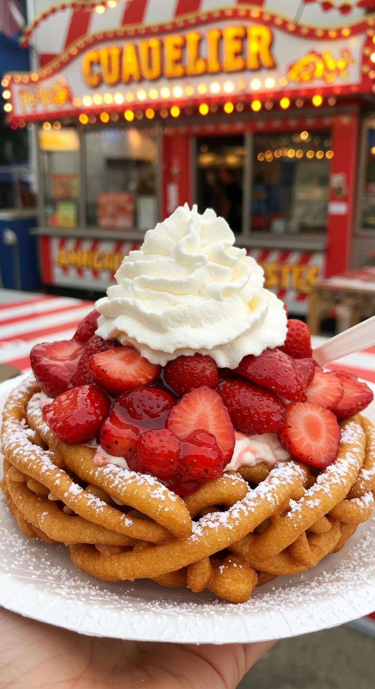 Strawberry Shortcake Funnel Cake — a crisp, golden funnel cake topped with macerated strawberries and whipped cream for the ultimate fair-meets-dessert mashup.