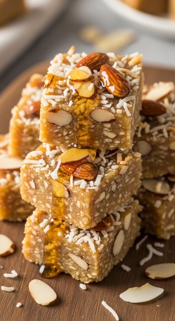 Enjoy these honey almond coconut bites chilled as a sweet, crunchy pick-me-up!