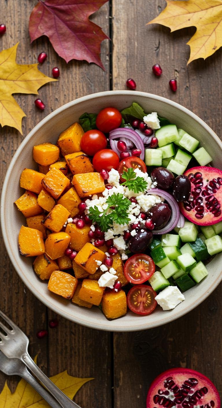 Autumn Roasted Squash and Pomegranate Greek Salad — a cozy, colorful bowl that sings of fall with sweet squash, bright pomegranate, and classic Greek flavors.