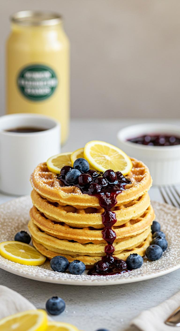 Light, fluffy lemon ricotta waffles topped with warm, sweet-tart blueberry compote — brunch bliss in every bite.