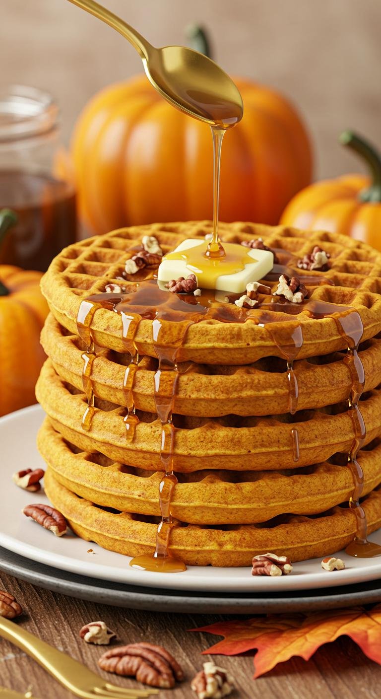 Warm, cozy pumpkin spice waffles with a sweet maple glaze—perfect for crisp mornings or weekend brunches.