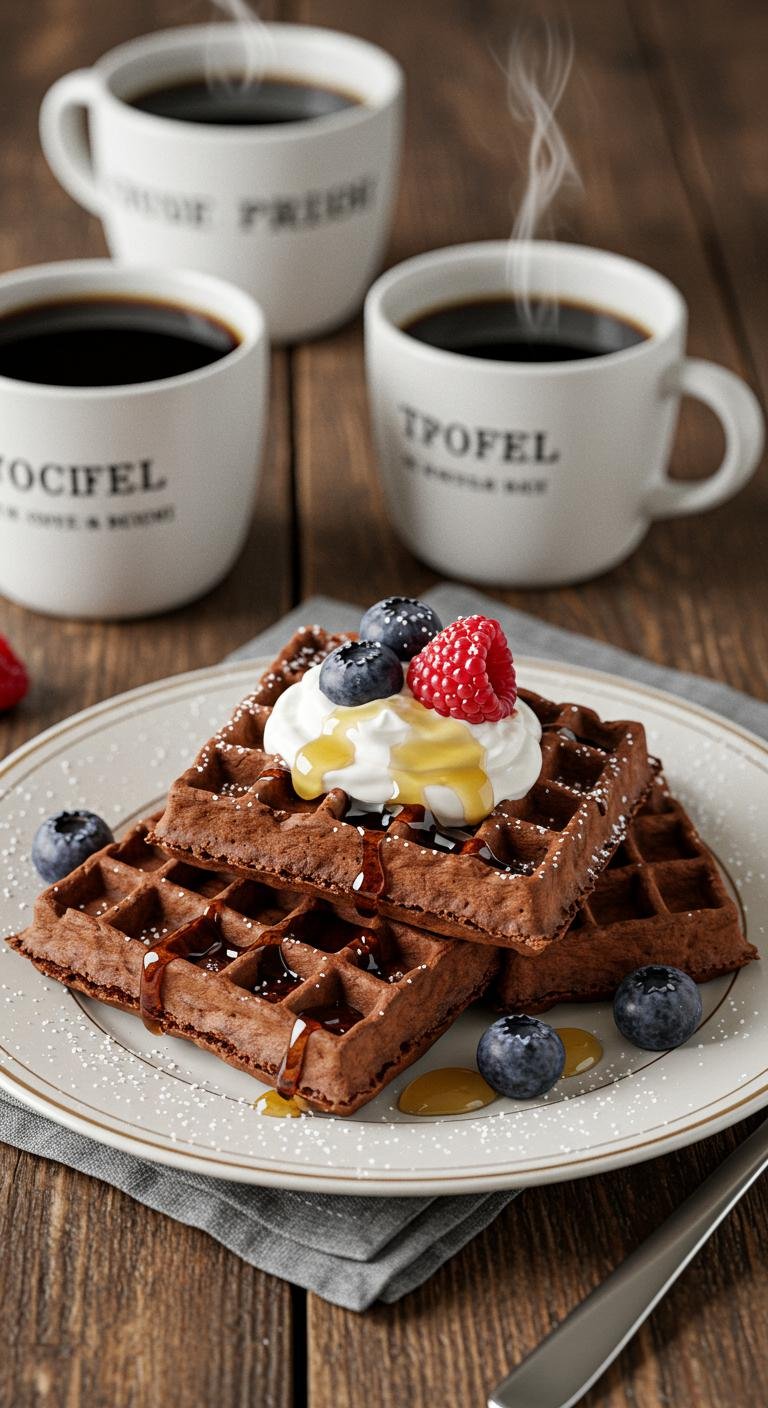 Enjoy these crisp, chocolatey Belgian waffles — perfect for an indulgent breakfast or dessert!