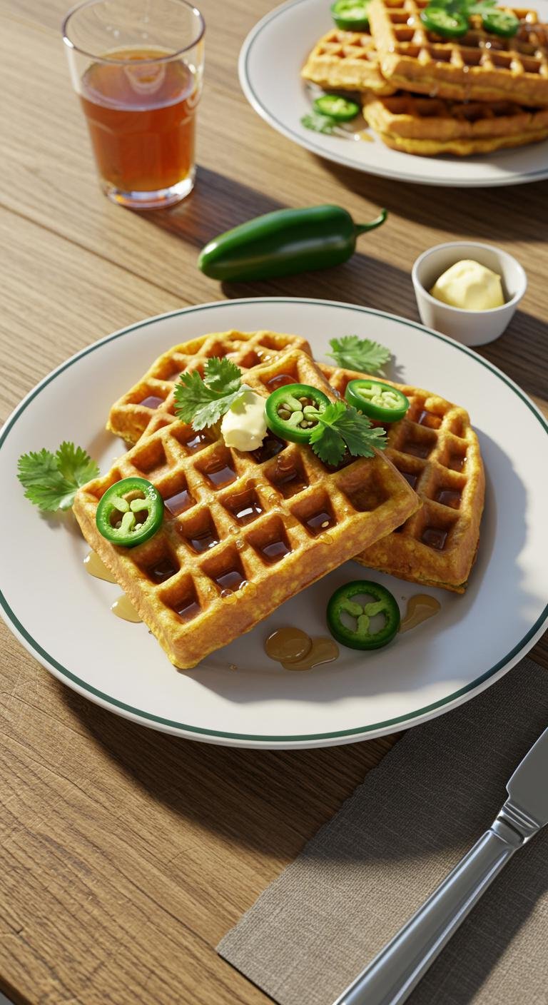 Crisp, slightly tangy cornmeal waffles with a kick of jalapeño — perfect for breakfast or a spicy brunch treat.