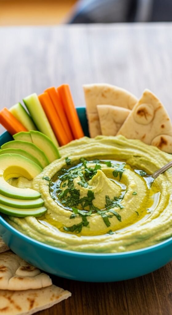Enjoy this vibrant avocado cilantro hummus — creamy, zesty, and made for dipping!