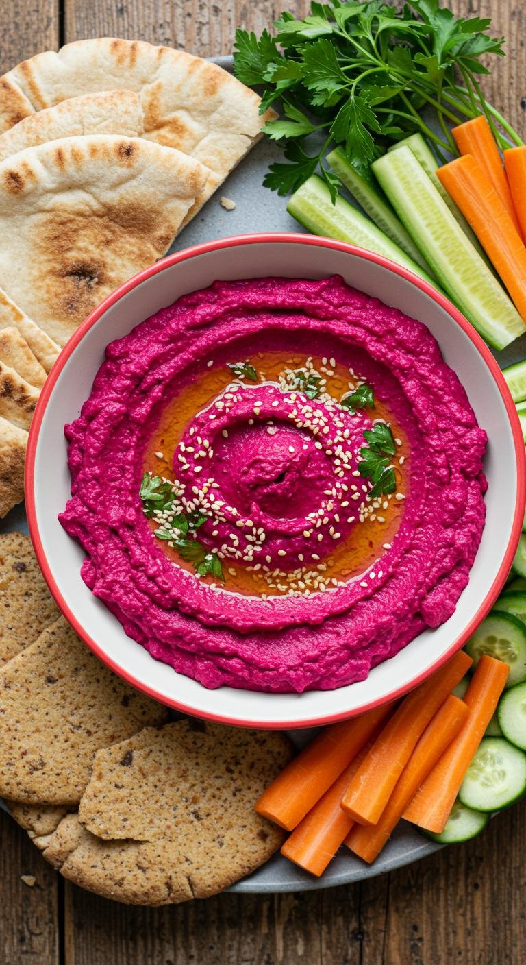 Bright, creamy beetroot hummus — a stunningly vibrant dip that brings color and sweetness to any snack table.
