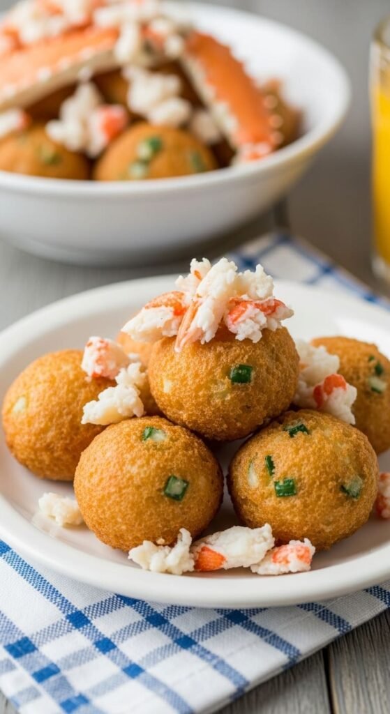 Crab and Old Bay Hush Puppies — crispy, savory balls with sweet crab and zesty Old Bay in every bite.