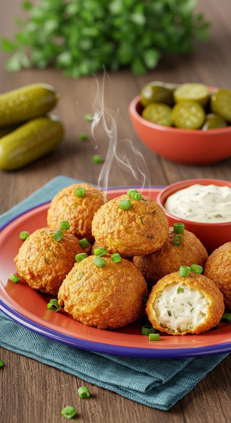 Crisp, tangy hush puppies with green onions and pickle brine — Southern comfort with a zesty twist.