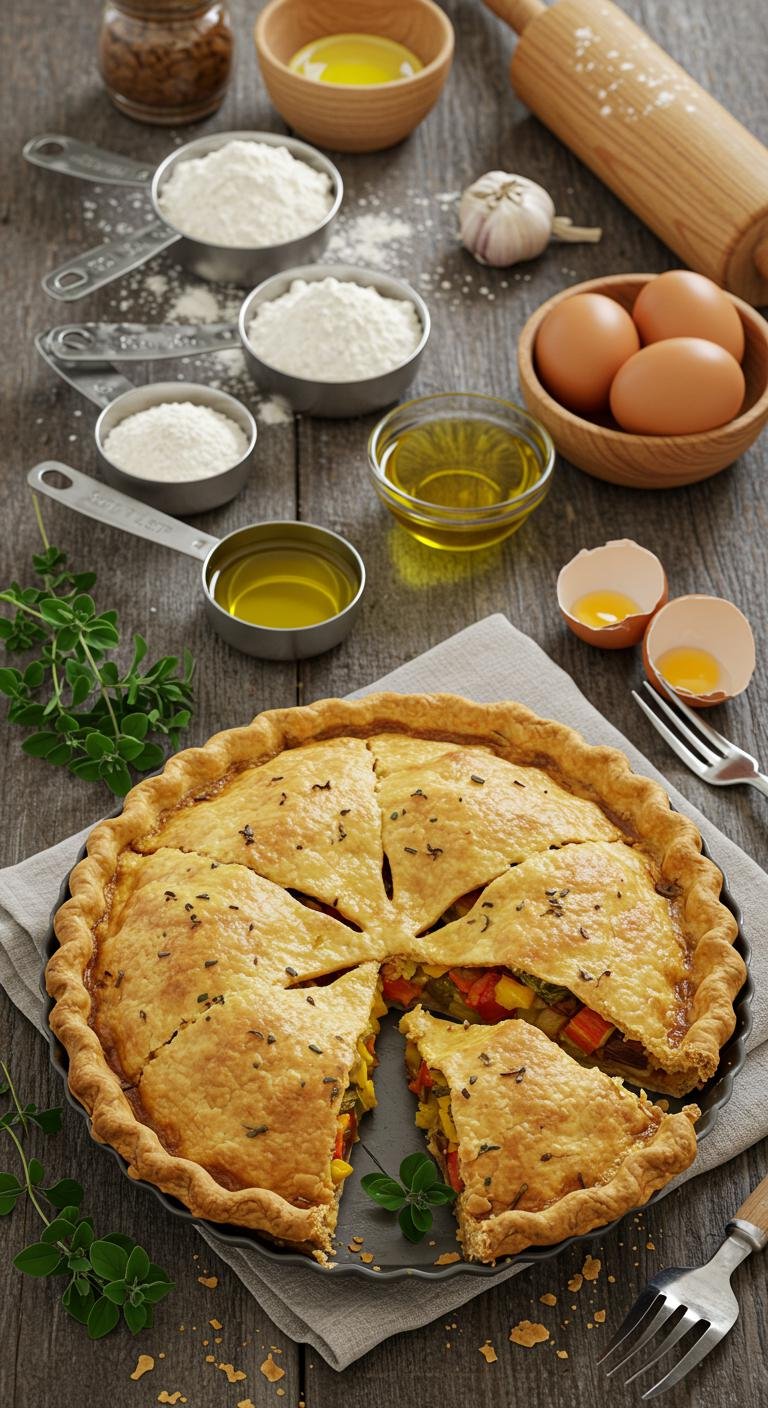 Enjoy a savory pie with a deliciously tender olive oil crust — perfect for quiches, pot pies, or vegetable tarts!