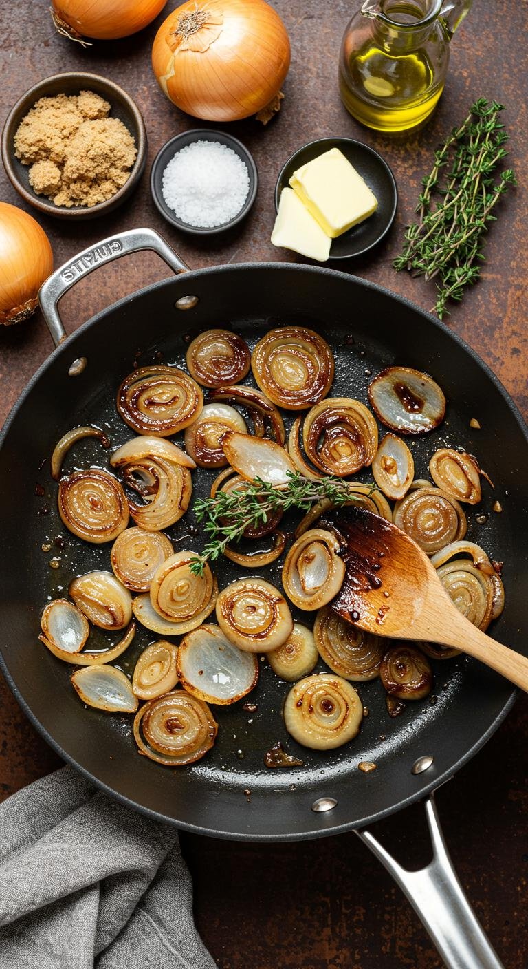 - Simmer gently until liquid reduces and onions are glossy and jammy, about 5–7 minutes.