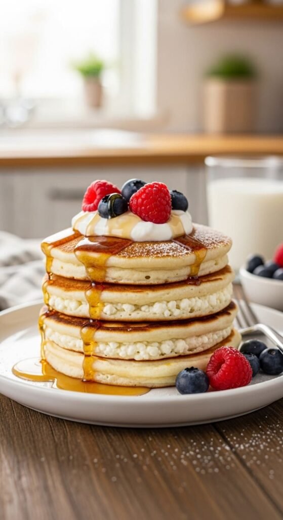 Bright, fluffy lemon ricotta protein pancakes — tangy, tender, and perfect for a cozy morning boost.