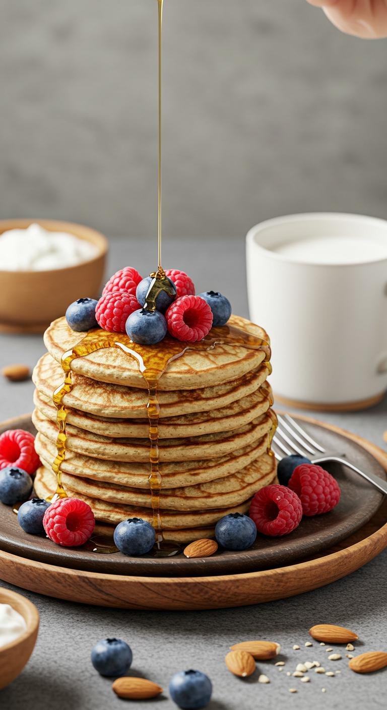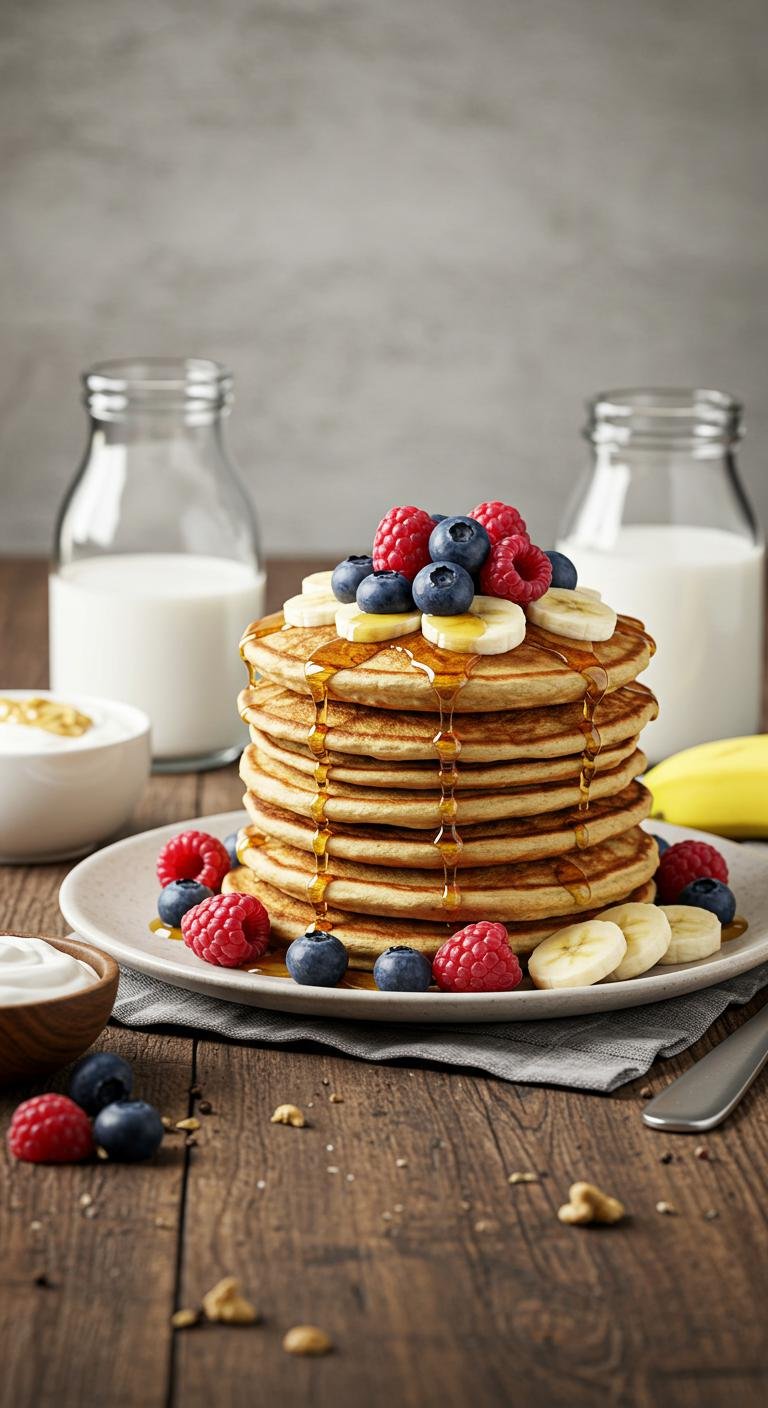 - Stack, top with berries, banana, Greek yogurt, nut butter, and a drizzle of maple syrup — enjoy every fluffy bite!