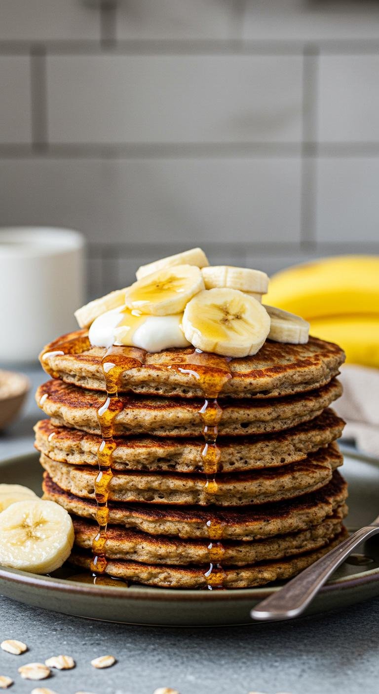Banana Oat Greek Yogurt Protein Pancakes — tender, fluffy, and loaded with creamy banana flavor and extra protein.