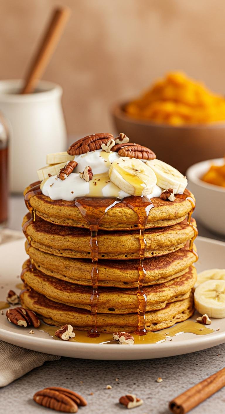 A warm, fluffy stack of pumpkin-spiced protein pancakes — cozy, nutritious, and perfect for fall mornings.