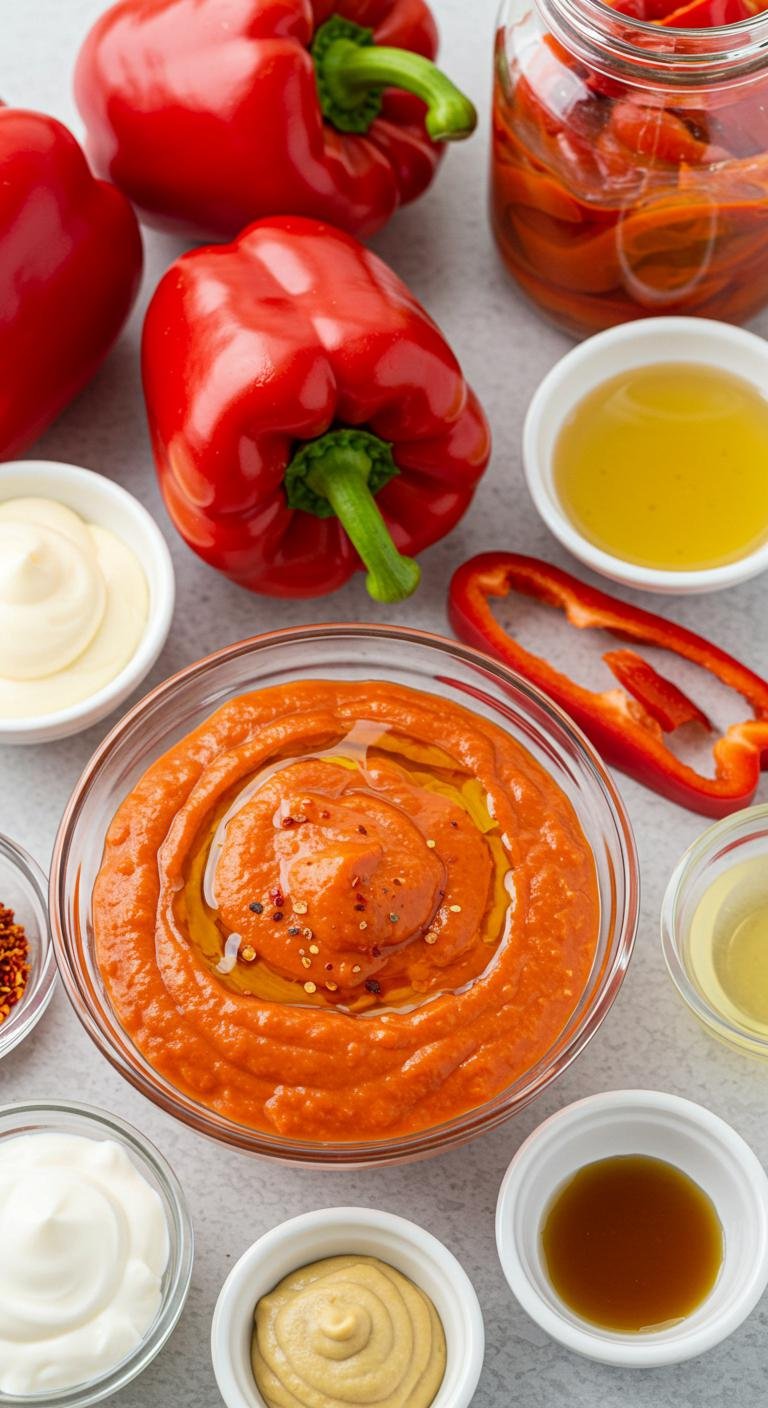 - Add roasted peppers, mayonnaise, sour cream (or yogurt), Dijon, and vinegar (or lemon) to a food processor or blender.