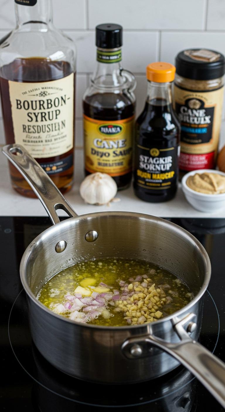- Pour in the bourbon and let it simmer 1–2 minutes to reduce slightly and cook off some alcohol.