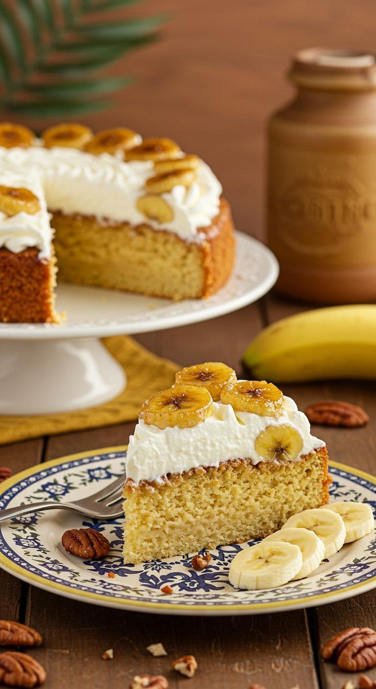 - Spread whipped cream over the soaked cake, arrange caramelized bananas on top, and sprinkle with toasted pecans or coconut if desired.
